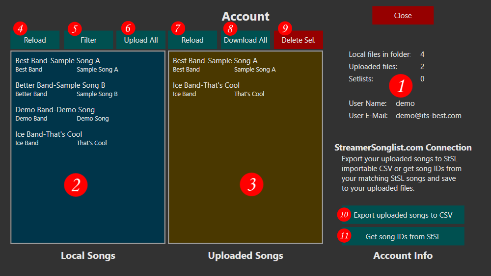 This button will create a CSV file containing all songs from your online account listed as in the example and ask you to save the file somewhere. This file can easily be imported to your StreamerSonglist.com account.